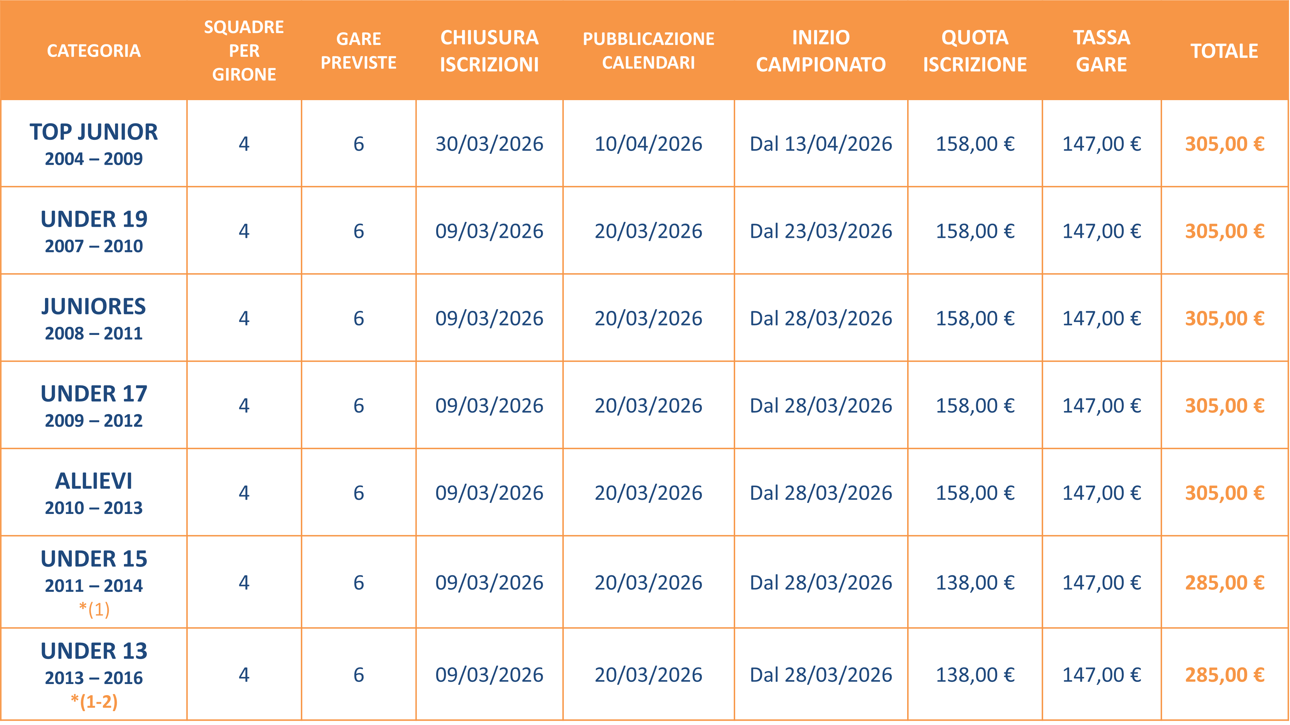 *(1): Sempre ammessa la partecipazione di ATLETE