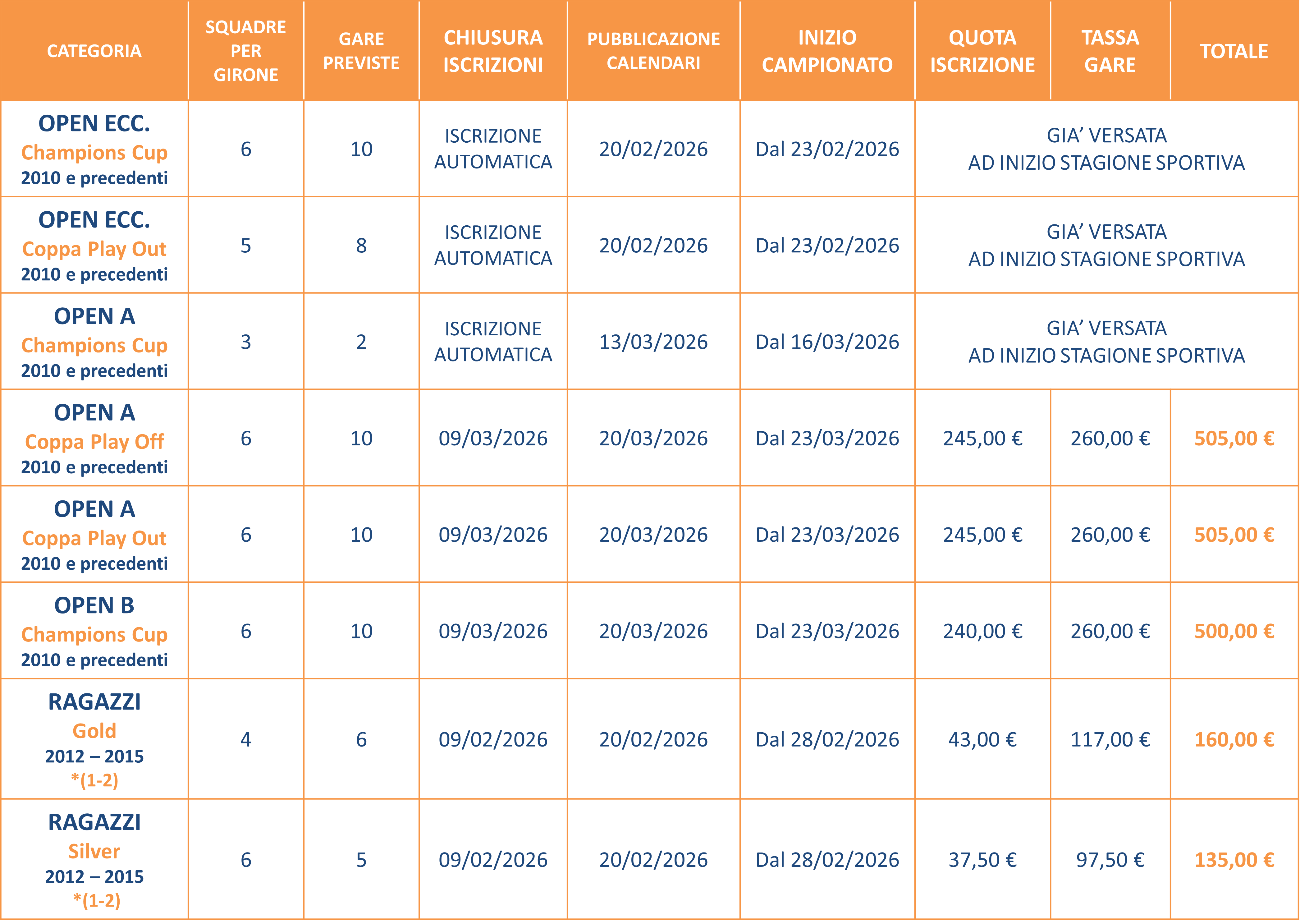 - Saranno programmati gironi di A/R o per fase Silver sola andata e in alcuni casi successive finali dedicate per le quali, alle squadre partecipanti, verrà addebitato in partita contabile l’importo di € 25,00 a gara.