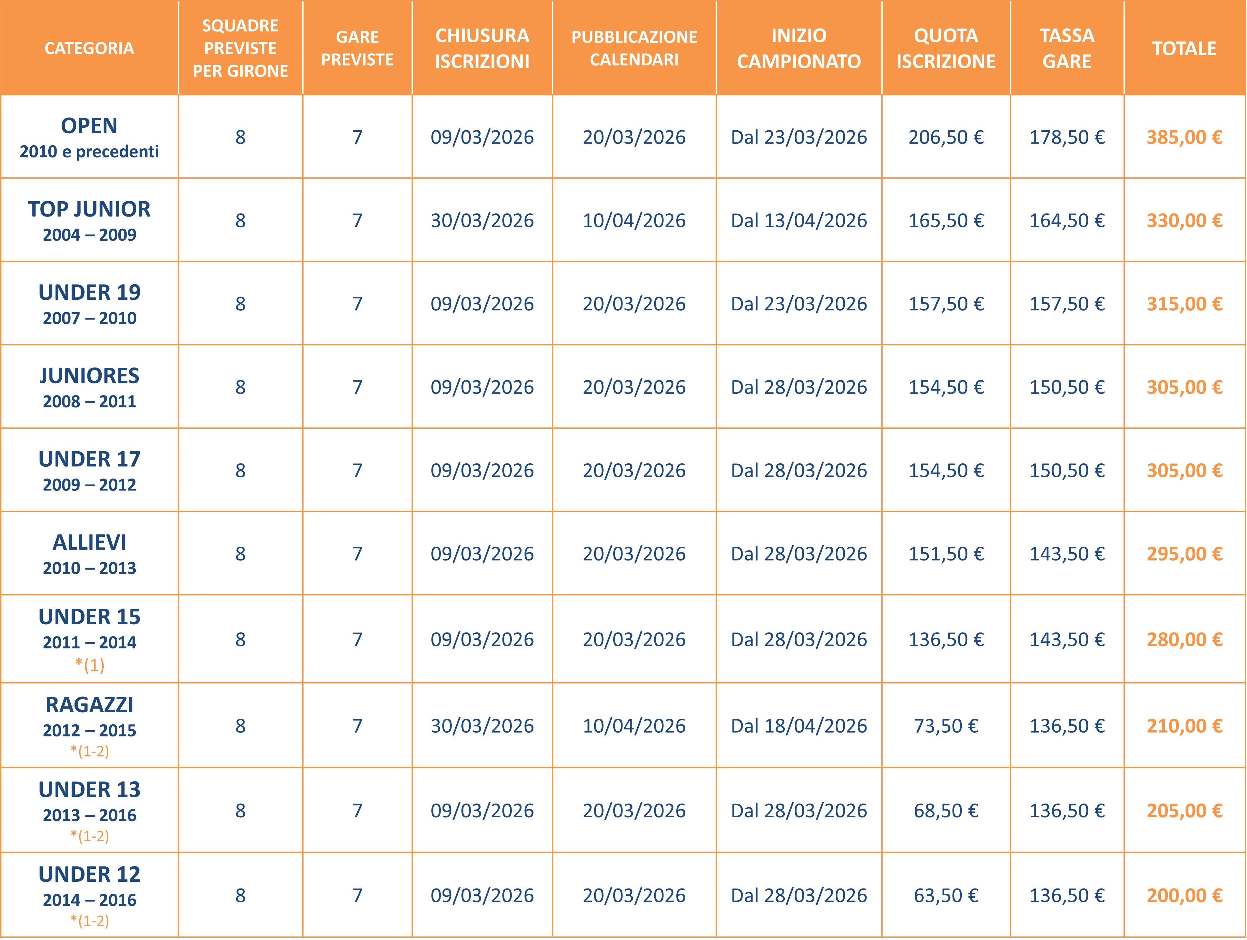 *(1): Sempre ammessa la partecipazione di ATLETE